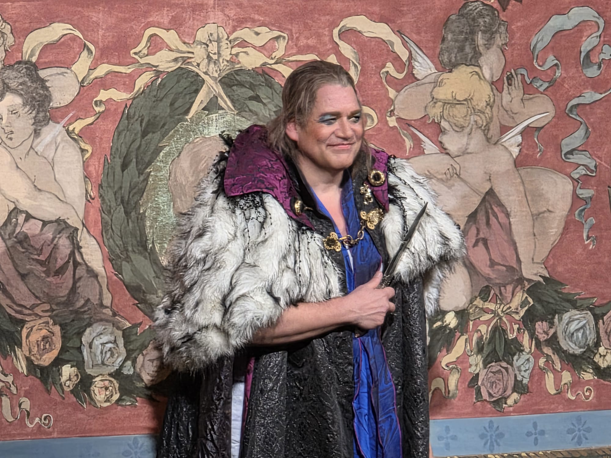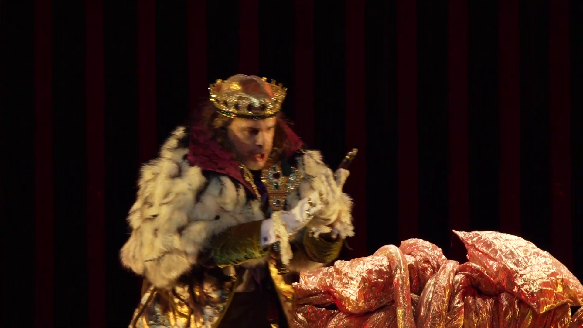 Maar na een wat ‘droge’ entree kwam het spel op de wagen en ontspon zich een vermakelijk en in sommige gevallen zeer lachwekkende vertoning waarbij de spelers, het koor en het orkest zich uitputten in de originele aria’s uit de operette ‘Eine Nacht in Venedig’. Aan het einde van het eerste gedeelte ging het licht aan, maar senator Delacqua bleef hoog op zijn troon zitten, roepend om zijn Barbara. Was het nu wel of niet pauze. Tenslotte was het een toneelknecht die hem uit zijn benarde positie kwam bevrijden. Einde eerste bedrijf.